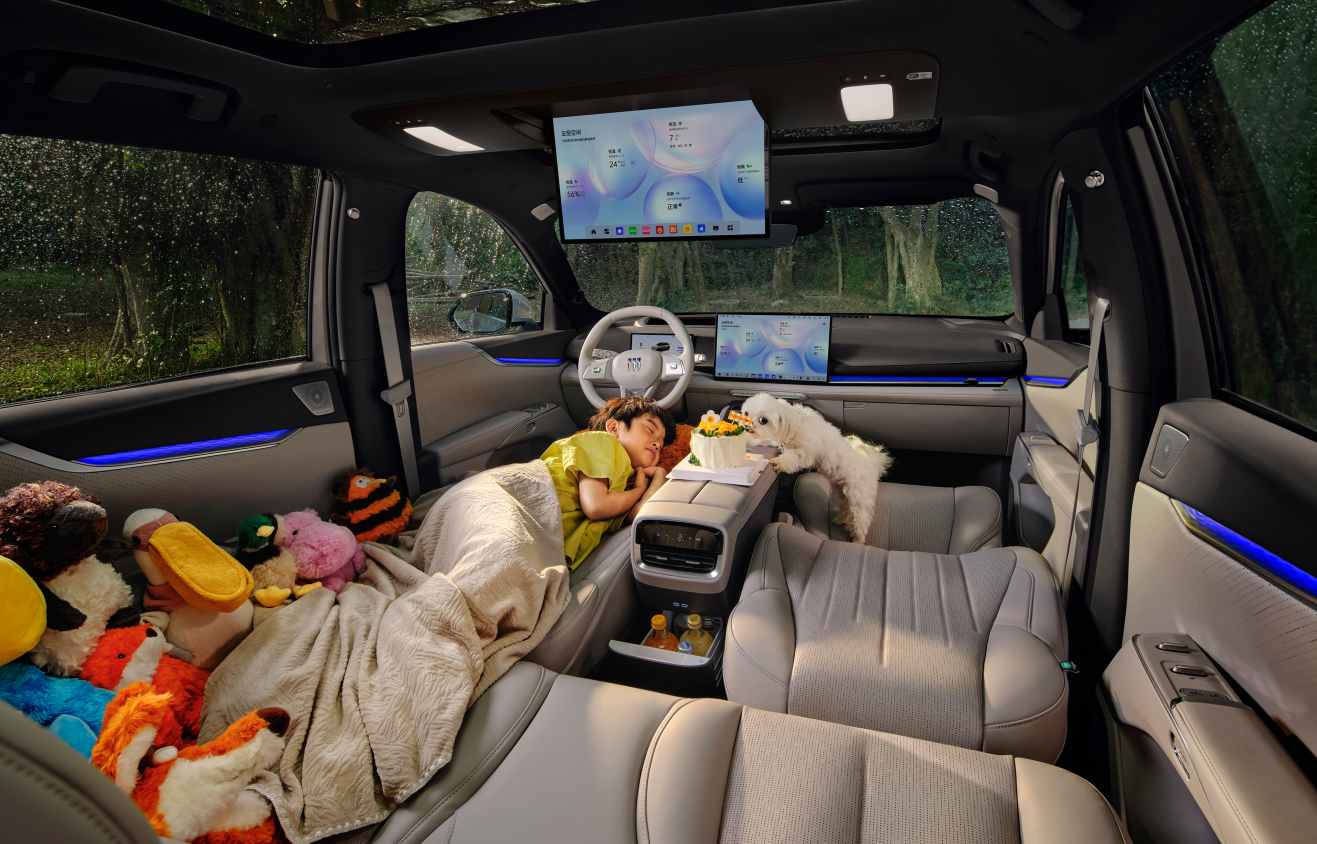 接下来必须重点说它的座舱,这也是至境E7最戳中国家庭的地方,官方喊出孩子的满分座舱,真不是营销口号,而是实打实的细节拉满。